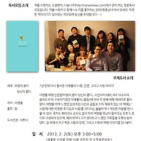 | [신청]2013년 2월 첫째주 청춘독서모임(주제도서: 바람이 분다 당신이 좋다) (1) | 2013.01.20 |